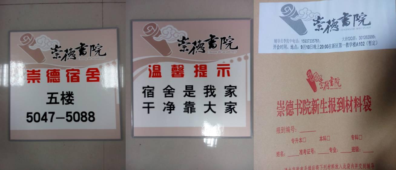 崇德书院为本次新工作也做了诸多努力和创新:一是在学生报到前就建立了大班的QQ群,利用QQ软件搭建了一个温暖的新生大家庭,让学生能提前得知学校的信息,让辅导员的关心更早的到达新生的身边;二是在新生报到袋附上辅导员姓名、电话、大班群号、班会时间、地点等详细信息,让新生第一时间就能有新伙伴、新朋友,消除彼此的陌生感;三是崇德书院为新生特别制作了宿舍分布图和温馨提示牌。不仅极大的提高了新生入住的速度和效率,也为宿舍增添了色彩,增强了学生的集体荣誉感和归属感,将书院的文化与关怀悄悄的渗入学生的每个角落,让学生充分感受到书院时刻在自己的身边。