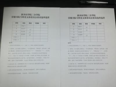 大会开始由李庆中讲解党支部选举的各项流程制度,并宣读《崇德书院学生第三党支部委员选举办法》全票通过。大会随后进行支部委员选举,确定监票人和计票人。按照有关规定,崇德书院学生第三党支部采用自上而下,上下结合的方法,广泛征求意见,充分酝酿讨论,确定崇德书院专科党支部委员会委员候选人预备人选为李庆中、郭航飞、孙星辰、张晟烨4名同志。经过支部委员会委员选举,大会应到党员9名,实到党员6名(另外3名党员在外地实习,采取委托他人代为投票),其中正式党员4名,超过应到会人数的五分之四,会议有效。大会共发出选票6张,收回选票6张,选举有效。