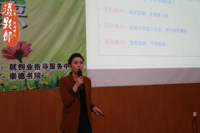 决赛分为PPT展示职业生涯规划及职业角色情景模拟两个环节。在比赛中,选手们通过SWOT分析法、霍兰德职业测评以及360度职业规划测评系统进行自我评价及就业环境剖析,找出自身的优势、劣势、制定出合理的就业准备及职业规划。他们中有的想成为主任护师,有的想当销售主管,有的想当心理咨询专家,还有的想开办残疾人舞蹈学校成为创业者。学生们自信大方的表现,自编自演贴近生活现实的职业角色模拟,博得了现场观众的阵阵掌声。经过激烈的角逐,来自崇德书院的管志华同学获得一等奖;马钰、阮世君等五位同学分获二、三等奖;张晟烨,郑红涛两位老师获得优秀辅导奖,崇德书院和羲和书院获得优秀组织奖。