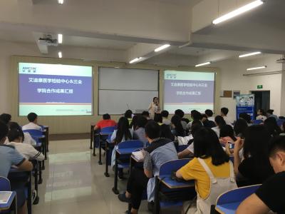艾迪康独立医学检验中心的负责人通过内容丰富的宣传视频与图文并茂的PPT,分别展示了他们在检验领域的先进设备以及对人员的严格管理,使在场的同学对第三方检验实习有了更直观的体会。在会后检验与影像学院副院长胡淼为大家认真分析了未来择业选择以及独立医学检验中心先进的管理体系对实习的好处。