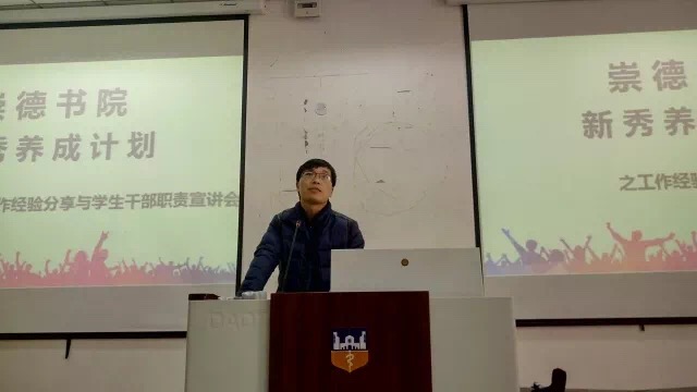 11月23日中午,崇德书院在教学楼D1室举行新秀养成计划第一期之书院全体学生干部培训。崇德书院院务主任赵超建、书院全体辅导员以及书院全体学生干部参与此次会议。