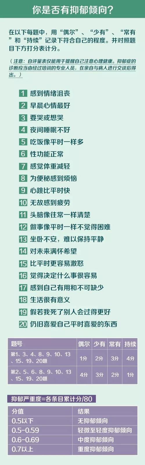 以下是美国权威抑郁自评量表,选择符合自己的程度――偶尔、少有、常有和持续。需注意,自评量表用于评价一下自己的心情,提醒自己注意心理健康是可以的。抑郁症的诊断应当由经过培训的专业人员,在亲自与病人进行交谈后得出。