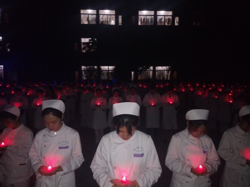 5月11日,同学们在淅沥的雨中,自发穿上护士服聚集到崇德书院广场,为遇难者祈福。同学们手持蜡烛,身上的护士服在烛火中显得更加纯洁,照亮通往健康的心灵彼岸。不久,广场已经站满了同学,同学们手持蜡烛摆成“5.12”图案和一颗勃勃的“爱心”,以此纪念汶川地震十周年,缅怀遇难同胞。