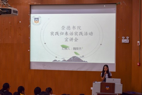 崇德书院实践团队主讲人纷纷上台讲述团队的实践过程、实践成果。他们的实践课题丰富多样,并结合自身专业特色和活动兴趣,针对文化、环境、社会形态等社会热点问题展开调查、服务、宣传等一系列活动,实践类型集中在社会民生热点调查行动和社会发展公益志愿行动两种,实践地点遍布河南。实践团队精彩的成果展示让同学们领悟深刻、受益匪浅。