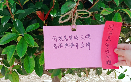 此次中秋传统文化拓展节活动包括收集家书和玩转飞花令两个活动环节,这两项活动将传统文化与娱乐竞赛巧妙结合,使同学们在潜移默化中学习和传承中国传统文化。最令人赞叹的环节就是“飞花令”了,它属于脑力比拼类项目。首先,发给挑战者每个人一张含有诗句的卡纸,分别去树上寻找两两结合进行配对,然后挑战者排好队依次说出包含上一个挑战者诗句中的最后一个字。同学们各个绞尽脑汁,展示他们的敏锐与机智。这不仅考查同学们的诗词储备,更是考验他们的临场反应和心理素质的较量。