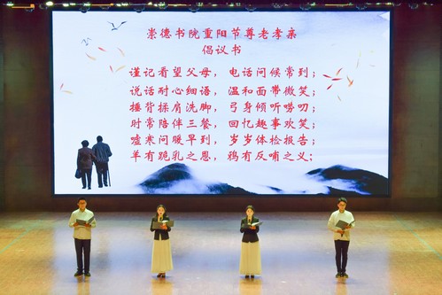 演出开始前,“您辛苦了,祝您重阳节快乐……”,崇德学子全体起立,向在新区辛勤工作的教授和青年教师们的父母鞠躬表达感谢之情。
