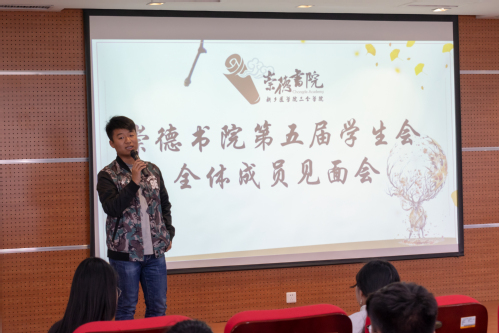 2018年11月2日,崇德书院第五届学生会全体成员见面会在我校图书馆五楼学术报告厅顺利举行。参加此次见面会的有崇德书院学生会主席团、各部门主任以及18级学生会新成员。