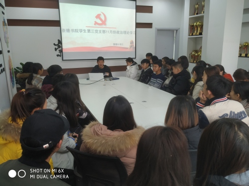 崇德书院学生第三党支部书记张晟烨主持会议并讲话,他说:“该书紧紧围绕新时代坚持和发展什么样的中国特色社会主义、怎样坚持和发展中国特色社会主义这个重大时代课题,阐释了习近平新时代中国特色社会主义思想的重大意义、科学体系、丰富内涵、精神实质、实践要求,强调习近平新时代中国特色社会主义思想是党和国家必须长期坚持的指导思想,号召进一步兴起学习贯彻习近平新时代中国特色社会主义思想新高潮,更加自觉地用习近平新时代中国特色社会主义思想武装头脑、指导实践、推动工作。”
