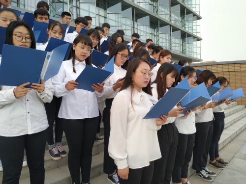 4月29日下午5点,朗诵人员集合在图书馆门前,他们服装统一,白衬衫黑裤子,个个精神饱满,他们手持文件夹,全身心投入朗诵之中,感情饱满、抑扬顿挫、慷慨激昂、声情并茂。“我们要用青春和热血,去换取人民的幸福,我们要用自己强健的身躯,去换取祖国的繁荣富强”,高亢的声音中充斥着对祖国的热爱,对英烈的敬佩,以及对自己的期望。