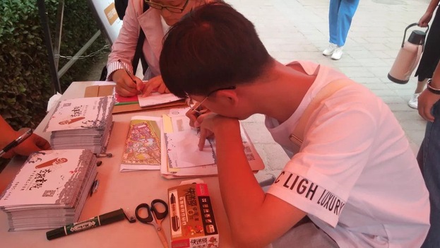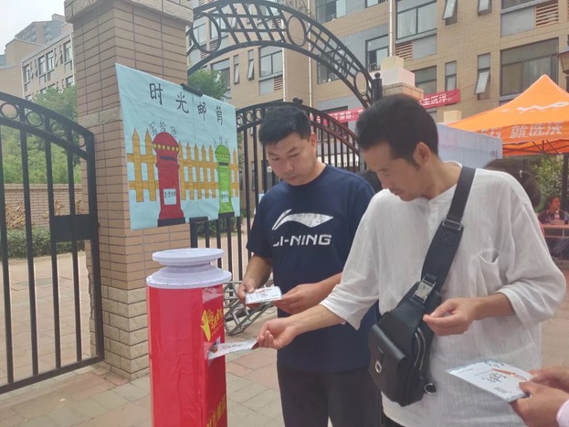 迎新现场,崇德书院在家长休息区开展了“大声说出你的爱”活动。新生家长可以在书院免费提供的校园明信片上写下想对孩子说的话,并投入现场摆放的“时光邮筒”内,学生志愿者统一收集整理后,在军训期间逐一送到新生手中。很多新生和家长,领取了明信片后,端坐在桌前,一笔一划地写下对孩子的祝福与嘱托。