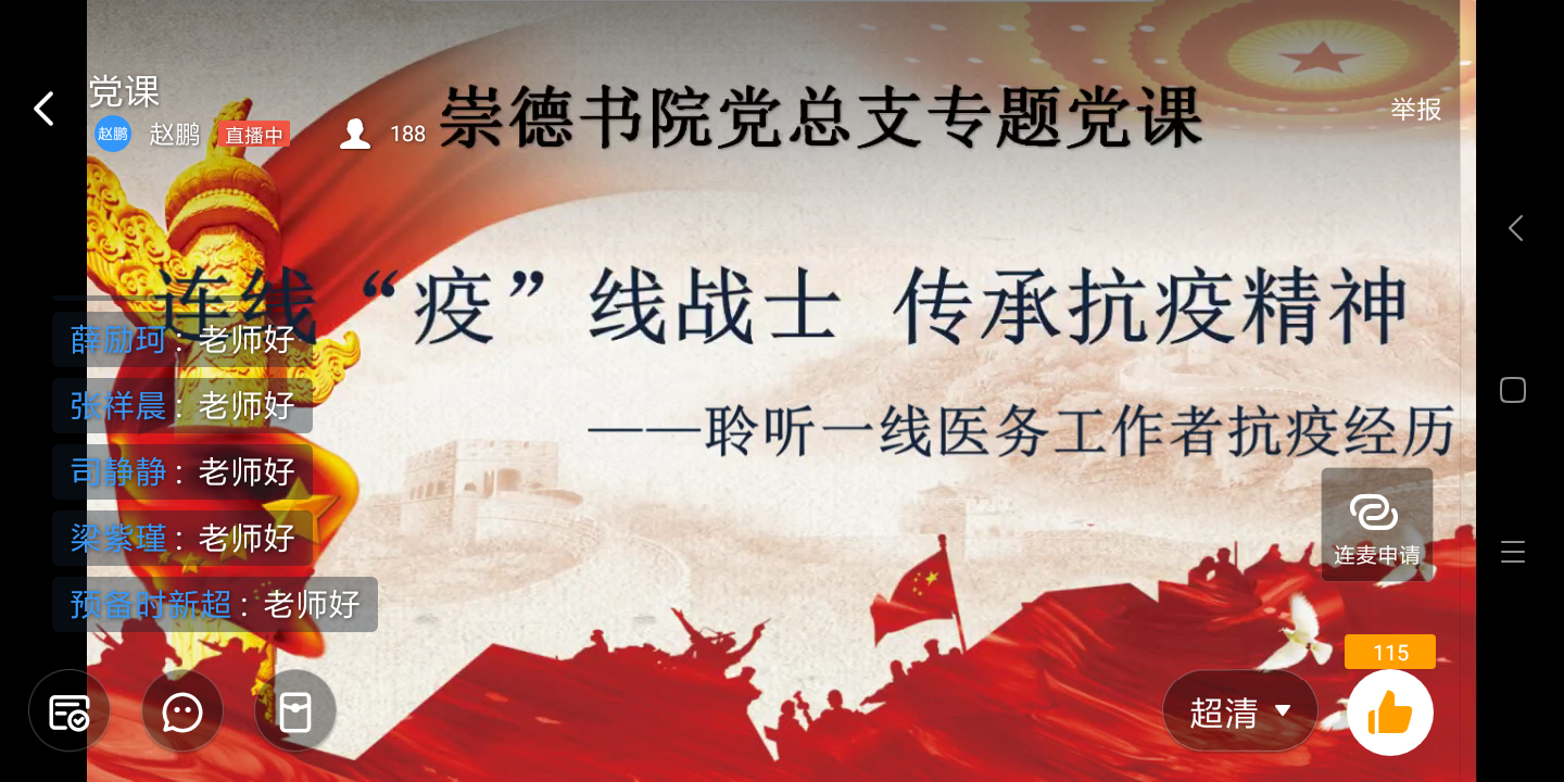 “在疫情期间,每天都很多先进事迹感动着我们。这次由党总支组织的党课,让我们与抗疫一线的医生面对面、零距离,我们很震撼。让我们明白了疫情就是命令,白衣就是战袍,也更加清晰了自己的责任与担当”学生王黎黎说。