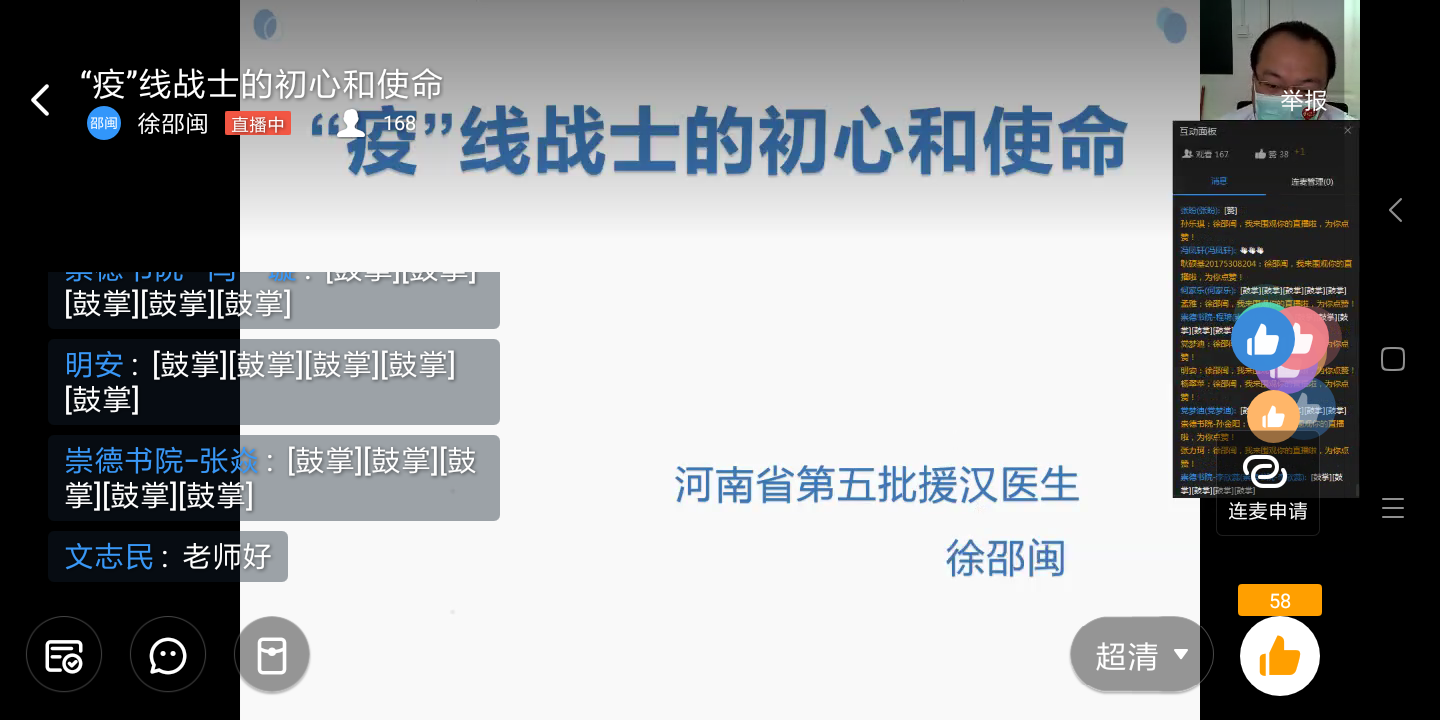 文章开头的自我介绍,发生在崇德书院党总支抗疫专题党课的课堂上。这次党课通过连线河南省第五批援鄂医疗队队员孟津县第二人民医院慢病管理中心、泰康社区卫生服务站主任徐邵闽,请他现场分享在抗疫过程中的经历和感受。