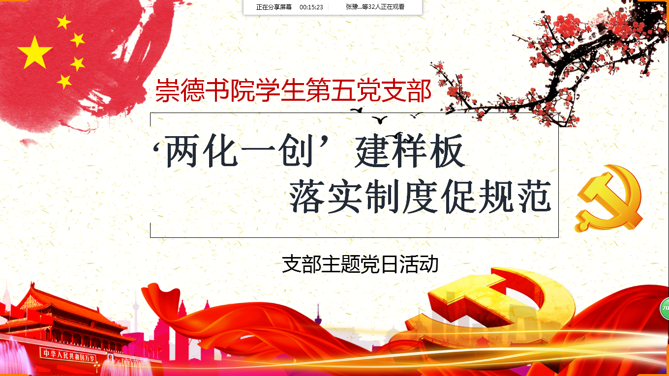 为落实学院党支部建设“提质创新年”,确保疫情防控不放松,支部建设质量再提升,督促各党支部学制度、用制度,建样板、学样板,进一步发挥党支部战斗堡垒作用。根据学院“‘两化一创’建样板、落实制度促规范”支部主题党日活动相关工作要求,5月22日-24日,崇德书院党总支各学生党支部通过QQ群、腾讯课堂等多种网络平台,开展本次主题党日活动。现将活动总结如下: