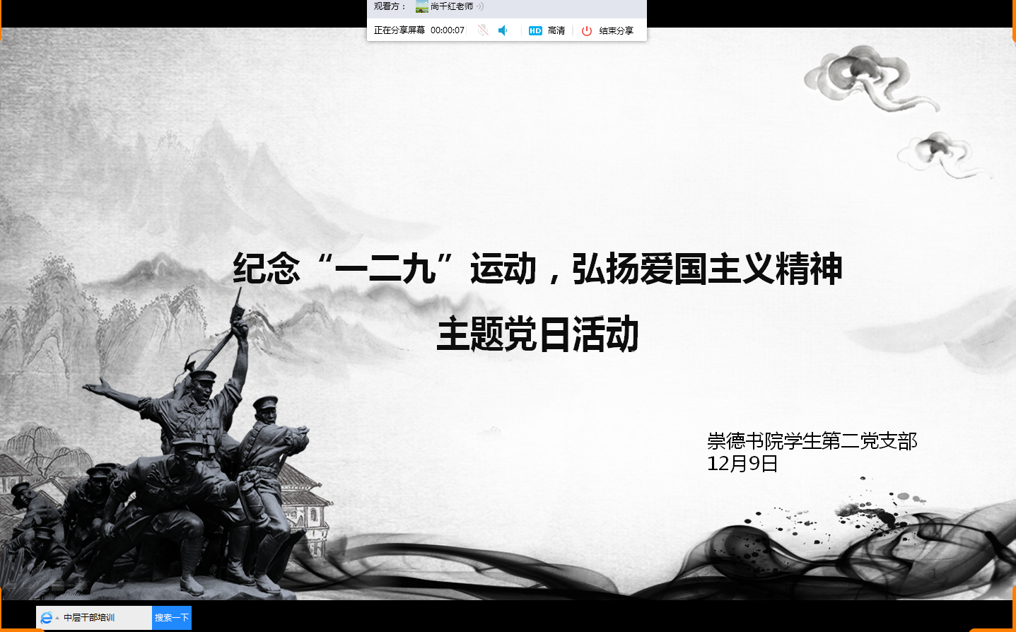 12月9日上午,崇德书院党总支开展“纪念一二九运动专题党课--铭记历史,不忘初心”活动,崇德书院党总支副书记杨翠苹是此次党课的主讲人。