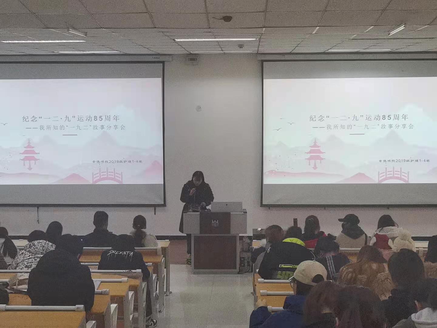 12月8日,为纪念“一二九”运动85周年,崇德书院2019级专科护理以“纪念一二·九运动85周年——我所知的一二九故事分享会”为主题,为全班学生举行了一场专题分享会。“一二九运动是一次伟大的抗日救国运动,也是一次伟大的学生爱国运动,它留给我们的宝贵财富是自强不息的爱国主义精神,所以同学们我们一定要好好珍惜现在的幸福生活,真正担负起青春的使命。”分享者王黎黎说。随后,大家在现场庄严地重温了入团誓词。