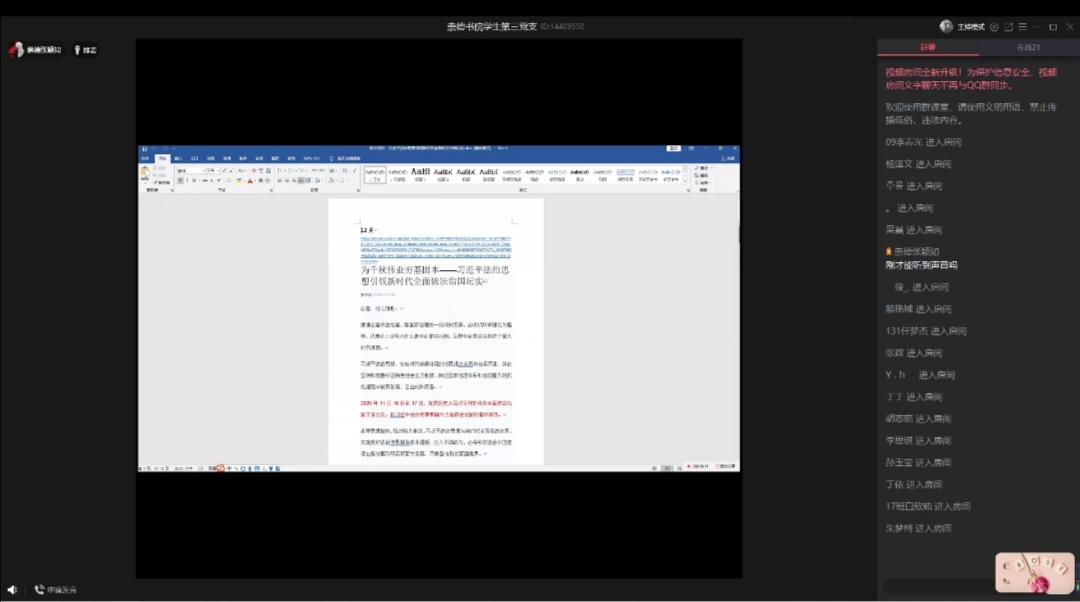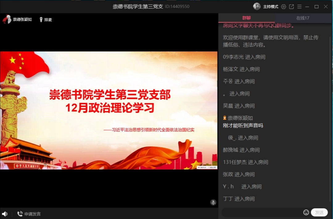 根据学校工作安排,崇德书院学生第三党支部通过线上平台开展此次政治理论学习,活动主题是“加强法治学习 弘扬宪法精神”。首先,张颖如向支部党员讲述依法治国是党领导人民治理国家的基本方略,法治是治国理政的基本方式。新时代的中国,跃上新的起点,也面对新的挑战。