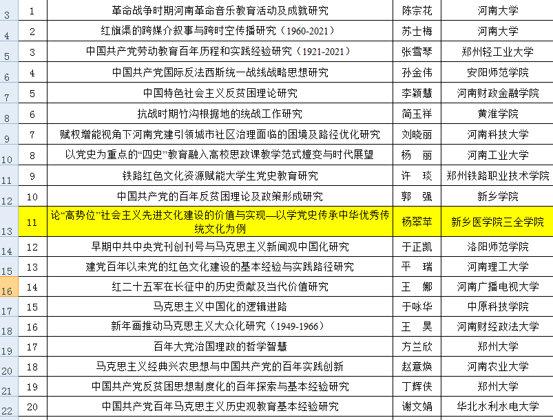 近日,根据《河南省教育厅关于组织开展河南省高校庆祝建党100周年专项课题申报工作的通知》(教办社语〔2020〕233号)要求,经各高校评选推荐、资格审查、专家评审等,全省立项30项。新乡医学院三全学院崇德书院党总支副书记杨翠苹主持申报的《论“高势位”社会主义先进文化建设的价值与实现—以学党史传承中华优秀传统文化》获批立项。