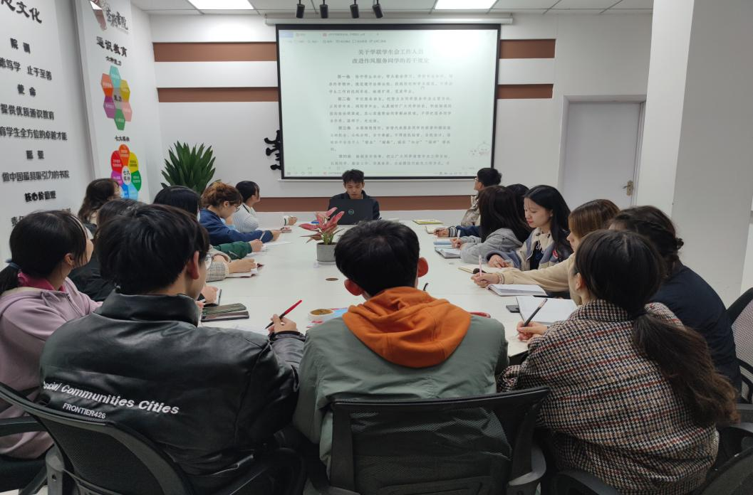 为了加强2021年秋季学期学生会分会组织工作人员宗旨意识和规章制度教育,崇德书院学生会分会于2021年10月8日下午5点20在辅导员办公室召开学生会新任职工作人员全员培训会,出席本次会议的有学生会主席团以及其他六大部门新任职的学生干部。学生会主席团成员吴凯主持本次会议。
