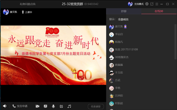 为庆祝党成立100周年,大力营造爱党信党跟党走的浓厚氛围,彰显党的强大凝聚力、号召力,根据学校党委的工作安排,7月8日晚上,崇德书院学生第七党支部在线上召开了“永远跟党走,奋进新时代”的主题党日活动,具体过程如下: