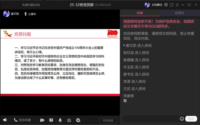 8月15日,崇德书院学生第七党支部通过线上方式,召开本支部专题组织生活会,支部全体成员参加。本次专题组织生活会围绕“学党史、悟思想、办实事、开新局”主题,认真贯彻“学史明理、学史增信、学史崇德、学史力行”要求,支部成员共同交流学习体会,查找差距不足。