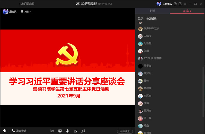 为了学习党建相关讲话和条例,发扬以案促改精神,崇德书院学生第七党支部开展“学讲话、践初心、勇实践”主题党日活动,党支部书记康文凯同志主持本次活动。根据学校党委的工作安排,9月16日晚上,崇德书院学生第七党支部在线上召开了“学讲话、践初心、勇实践”的主题党日活动,具体过程如下: