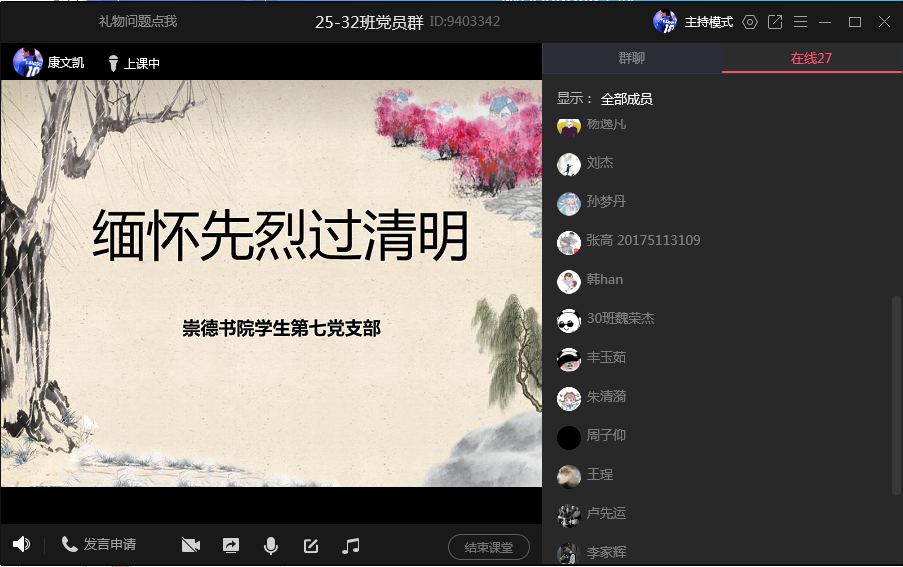 清明节到来之际,全国各地缅怀英烈、纪念英雄的气氛日渐浓厚。从中国人民抗日纪念馆到全国各地的烈士陵园、从网上的纪念活动到各地举办的祭奠仪式,中国人民以不同形式追思心中的民族英雄。4月4号,崇德书院学生第七党支部也进行了线上会议,通过学习革命先烈的英勇事迹,缅怀革命先烈,活动过程如下: