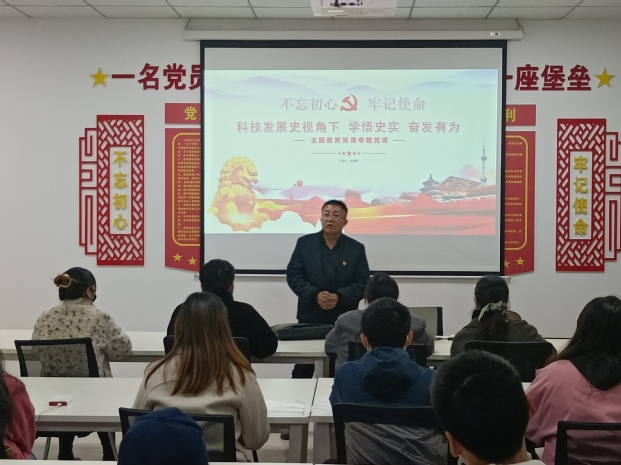课堂上,陈继超带领大家回顾了我们党的光辉历程,重温了我们党从成立以来,为中华民族建立的不朽功勋。他从只有中国共产党才能拯救中国,中国人民站起来了、只有中国共产党才能发展中国,中国人民富起来了、只有中国共产党才能治理中国,中国人民强起来了、坚持中国共产党的全面领导,新中国取得巨大成就和牢记初心使命,自觉推进自我革命四个方面教育引导学生不断提高科学文化素质,不断突破自我,提升自己的科研能力,增强爱党爱国情怀和社会责任感,争做新时代合格大学生。