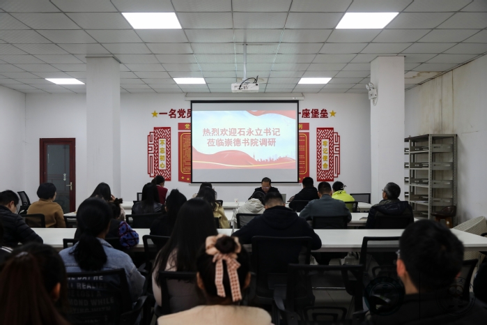 本次联系基层党支部活动开展前期,崇德书院党总支负责人结合工作实际,从书院基本情况、工作思路、开展成效及存在的问题几个方面做了专题汇报。石永立对书院工作所取得的成绩给予高度肯定,勉励书院再接再厉,同时指导书院在接下来的工作中要持续推进品牌建设,主动总结和推广成功经验。