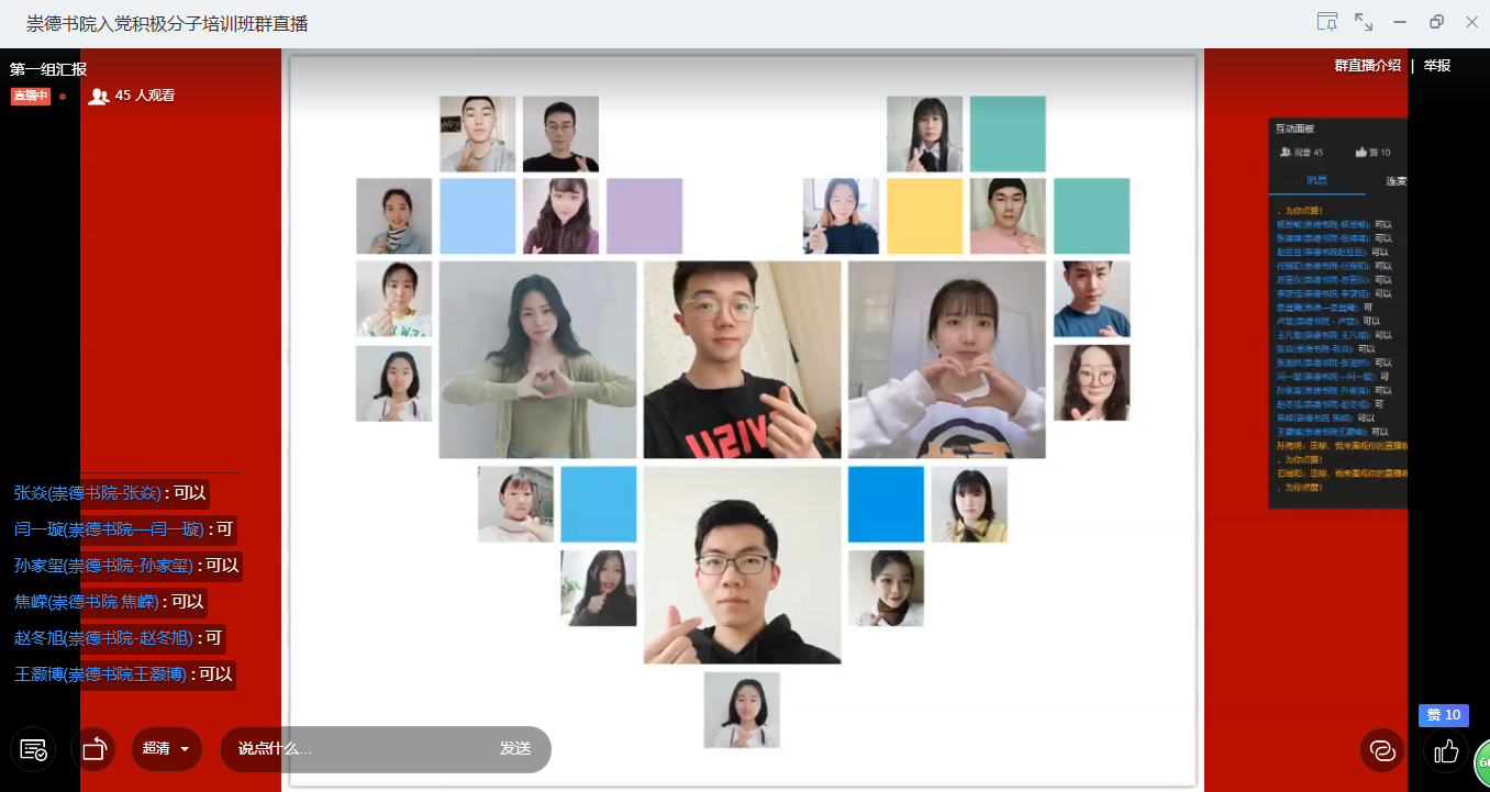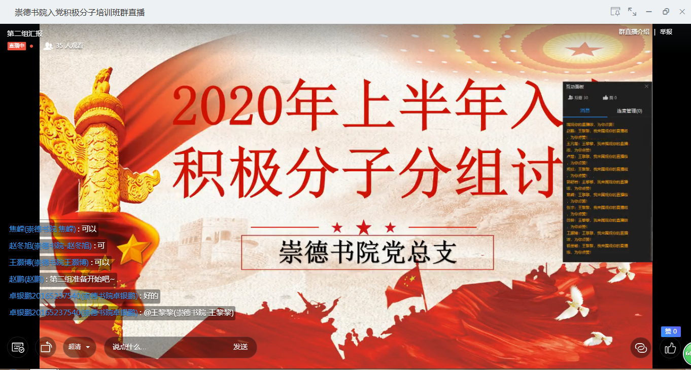 为引导广大青年学生坚定理想信念,加强党性修养,进一步深化“不忘初心牢记使命”主题教育成果,4月18-19日,崇德书院党总支共44名入党积极分子在学院党委的统一组织下,在线上“钉钉”课堂参加了“共抗疫情、爱国力行”专题培训。