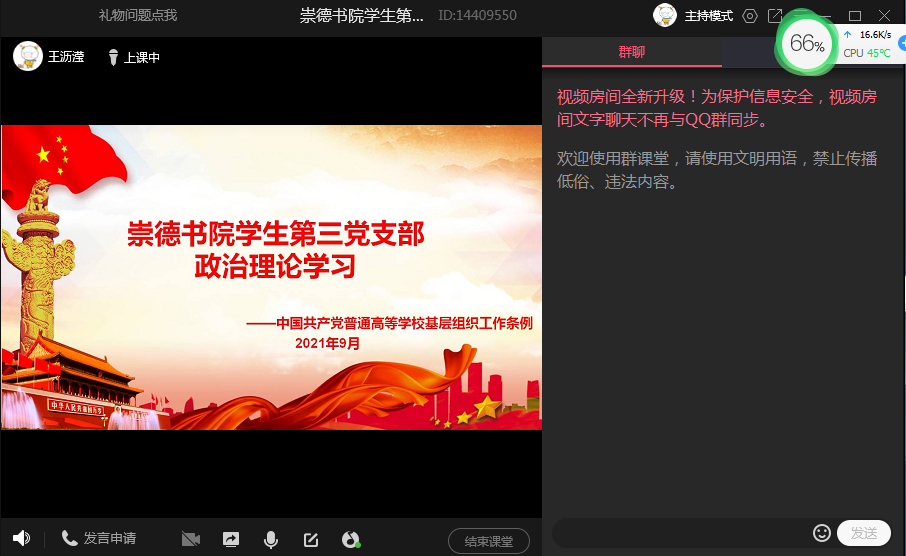 9月22日,根据学校工作安排,崇德书院学生第三党支部通过线上平台开展此次政治理论学习,本次学习的内容为《中国共产党普通高等学校基层组织工作条例》,党支部书记王沥滢同志组织了本次会议。