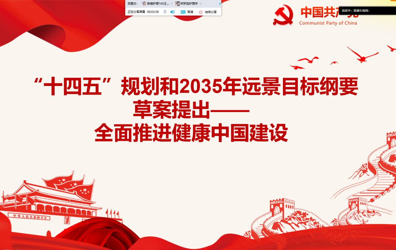 推进国家治理体系和治理能力现代化是党的十九届五中全会的重要议题,而且全会审议了中共中央关于制定国民经济和社会发展第十四个五年规划和2035年远景目标,为未来5年乃至15年中国发展擘画蓝图。为贯彻新发展理念,实现高质量发展,崇德书院学生第一党支部于5月7日在党务活动室开展了“学习《‘十四五’规划和2035年远景目标纲要─全面推进健康中国建设》”的主题党日活动。活动由支部书记牛晓冉主持,崇德书院学生第一党支部在校生和实习生参加。