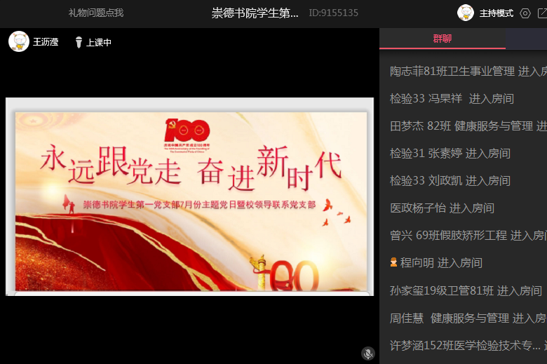 为了坚定不移走好脚下路,满怀豪情奋进新征程,从党的光辉历程中汲取奋进力量,弘扬光荣传统、赓续红色血脉,向着第二个百年奋斗目标奋勇前进。进一步加强党员教育、管理和服务,引导广大新党员在新的岗位上继续发挥先锋模范作用,崇德书院学生第一党支部于7月8日下午在线上开展了“永远跟党走,奋进新时代”的主题党日活动。活动由支部书记牛晓冉主持,崇德书院学生第一党支部全体成员参加。