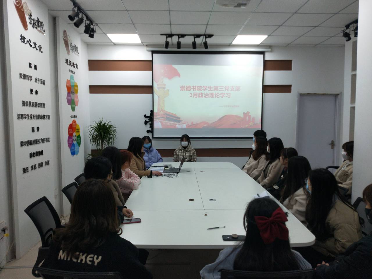 根据学校工作安排,崇德书院学生第三党支部通过线上平台开展此次政治理论学习。会议开始,张颖如同志指出,党的十九大以来,习近平总书记发表了一系列重要论述,提出了许多具有原创性、时代性、指导性的重大思想观点,进一步丰富和发展了党的理论创新成果。《习近平谈治国理政》第三卷集中展示了马克思主义中国化的最新成果,是全面系统学习习近平新时代中国特色社会主义思想的重要文献。深入学习贯彻习近平新时代中国特色社会主义思想,就要全面系统、联系实际、原原本本地读原著、学原文、悟原理。作为党员,为更好地学习好贯彻好相关理论著述,我们应该着重聚焦以下学习主线。首先,要聚焦坚持和加强党的全面领导。要聚焦坚持以人民为中心。再则,要聚焦防范化解风险挑战。最后,要聚焦携手构建人类命运共同体。