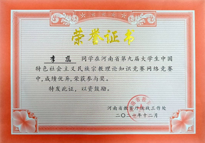 近日,河南省教育厅公布了河南省第九届大学生中国特色社会主义民族宗教理论知识竞赛结果。我校学生在竞赛中表现突出,其中崇德书院徐艺珂、李蕊同学喜获佳绩。