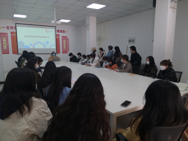 为了严控疫情管理工作,提高学生的自我管控意识,3月23日,在崇德书院党务办公室召开了“崇德书院警示教育专题会议”讲座,崇德书院党总支副书记杨翠苹为此次主讲人,主要带领21级班委做好班级管理工作。