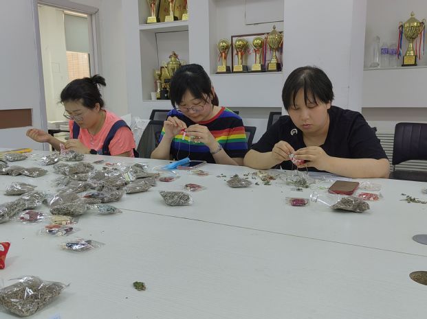 活动开始,王静老师首先讲解了端午节的由来和习俗,并对端午节香囊做了大致的介绍,让大家对端午节的传统民俗文化有了充分的了解。接下来在老师的讲解和指导下,大家开始学习制作香囊,从穿针引线开始,用平针与藏针法,一针一线地完成了香囊的缝合,然后填香料、挂圆珠。大家兴趣高昂,工作认真,在淡淡的草木清香中,一个个小巧玲珑、沁人心脾的香囊不断从手中“变”出。