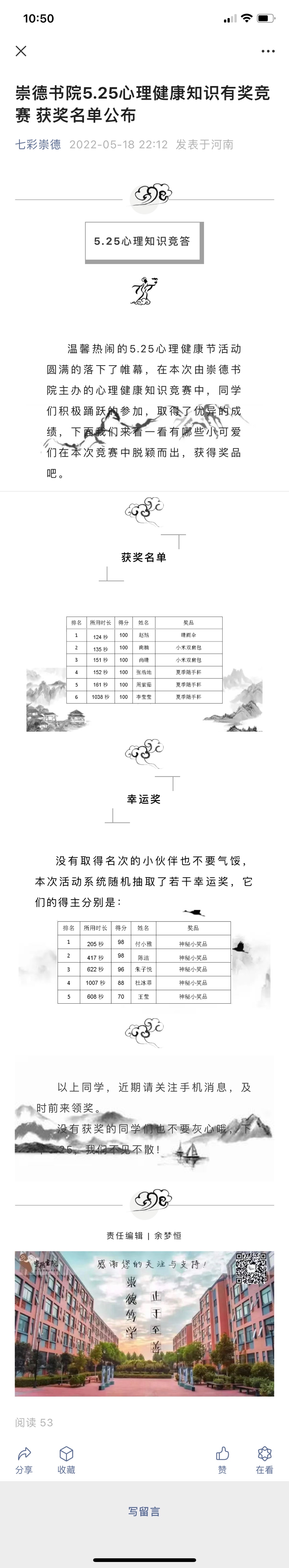 为分发挥书院心理二级辅导站作用,营造良好氛围,积极拓展心理知识宣传渠道。崇德书院举办“百花齐放·谁与争锋”——心理知识竞赛活动。本次心理健康知识竞赛受到了同学们积极踊跃的参与,根据得分进行排名,共决出一二三等奖。在没有取得名次的同学中,系统随机抽取了若干幸运奖,以此鼓励同学们树立热爱生活、积极向上的健康心态。
