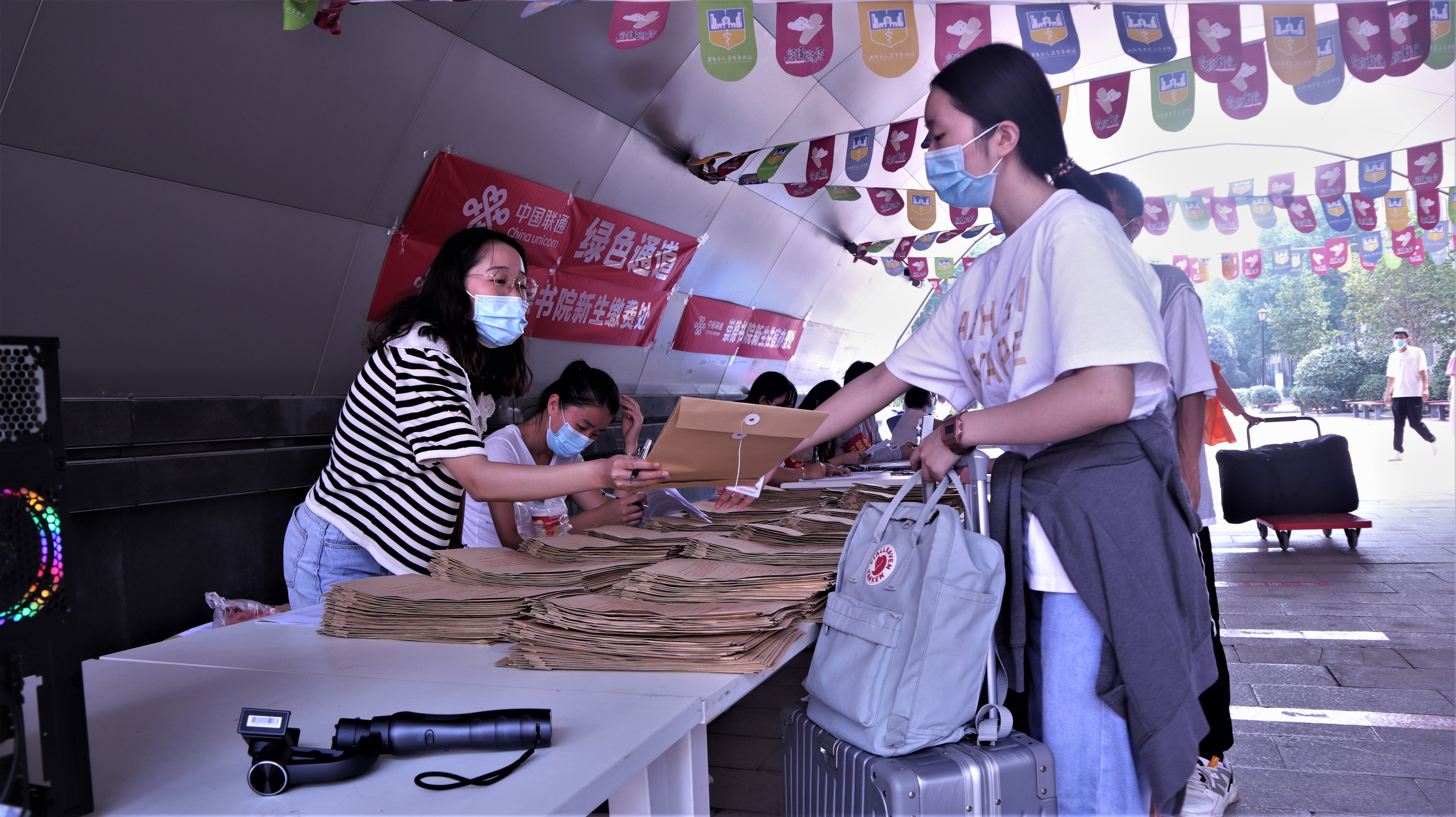 “还记得我大一来校报到的时候,学长学姐们热心的帮我搬行李,那个场景现在回想起来也很暖心。作为学姐,为新生提供帮助是对我们书院互帮互助这一传统的传承,我觉得我有这份责任。今天来来回回搬了几十趟,虽然很累但是我很开心!”陈美君笑呵呵地说道。“并且,看到我们书院辅导员忙碌的身影,我也不觉得累了,只觉得很感动。”陈美君补充道。“同学们,大家先把身份证拿出来刷卡登记信息,随后来这里领取档案材料,办过贷款的同学到第二张桌子填写表格,没有贷款的同学直接到第三张桌子领钥匙哈!”辅导员张芹芹卖力的吆喝着,生怕学生听不到。报到的每个岗位都设有一位辅导员,在志愿者的配合下解答新生疑问,并维持好现场秩序。