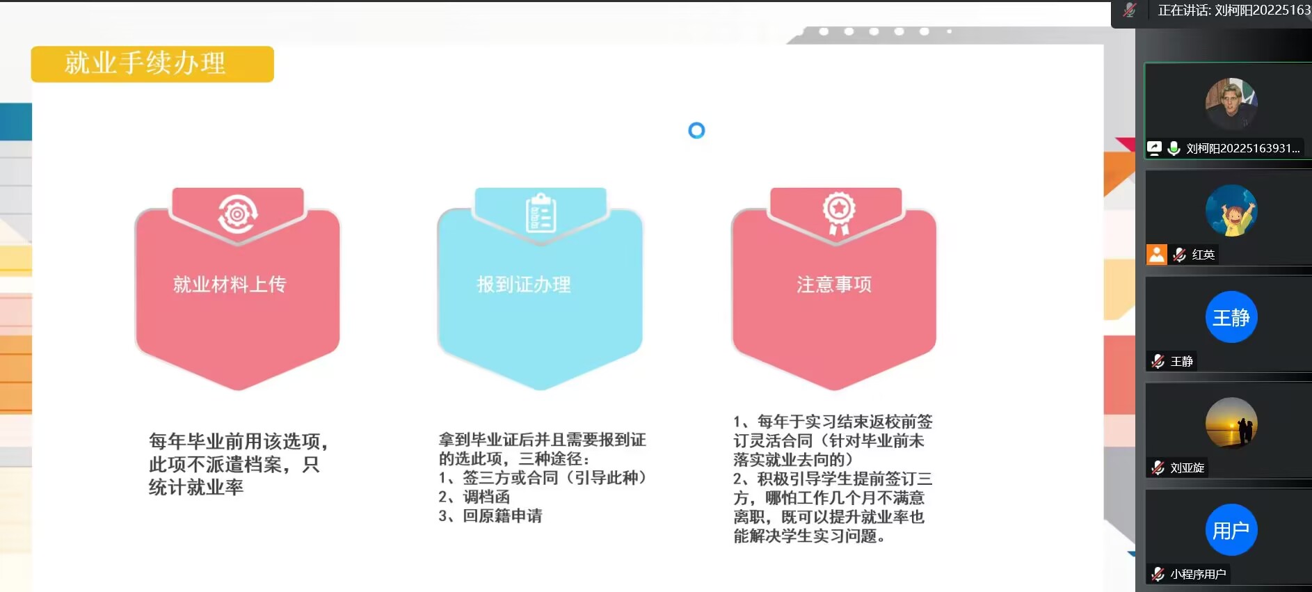 李镖飞指出,我校关于创新创业相关指导主要包括“简历制作大赛”“互联网+大赛”“大学生职业规划大赛”以及“毕业生毕业办理手续”四个方面。他针对目前正在开展的大学生职业规划大赛进行详细介绍,邀请老师观看省级获奖作品的视频,并从参赛选手的语音语调、演讲稿、PPT制作等方面解析其获奖的原因。要求老师们在指导学生的过程中要着重注意演讲稿的流畅性、逻辑性,以及PPT每部分之间的衔接性。随后李镖飞对其他大赛举办时间、流程、重点以及毕业生毕业办理手续相关注意事项等作了详细的介绍,并结合相关案例详细剖析。老师们纷纷表示受益匪浅。“作为新辅导员,此次培训会对我有很大的帮助,让我进一步明晰了对学生们的指导方向以及指导重点。”魏欣珂说道。