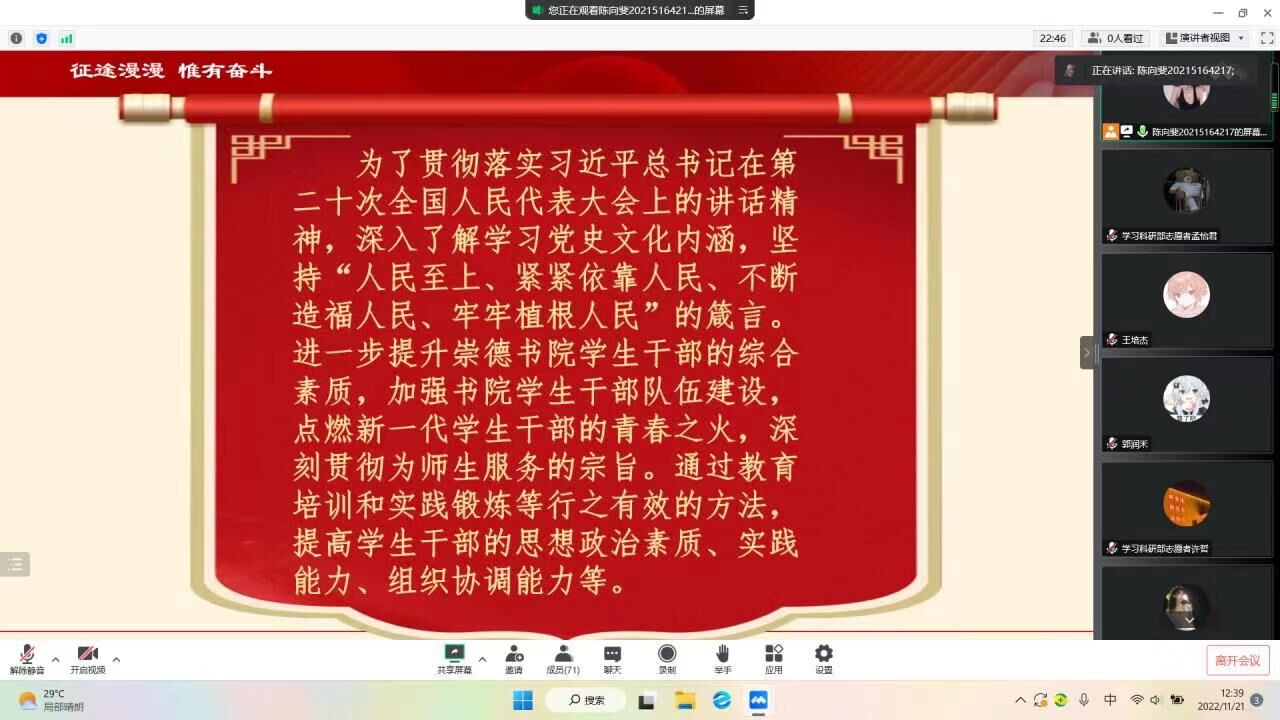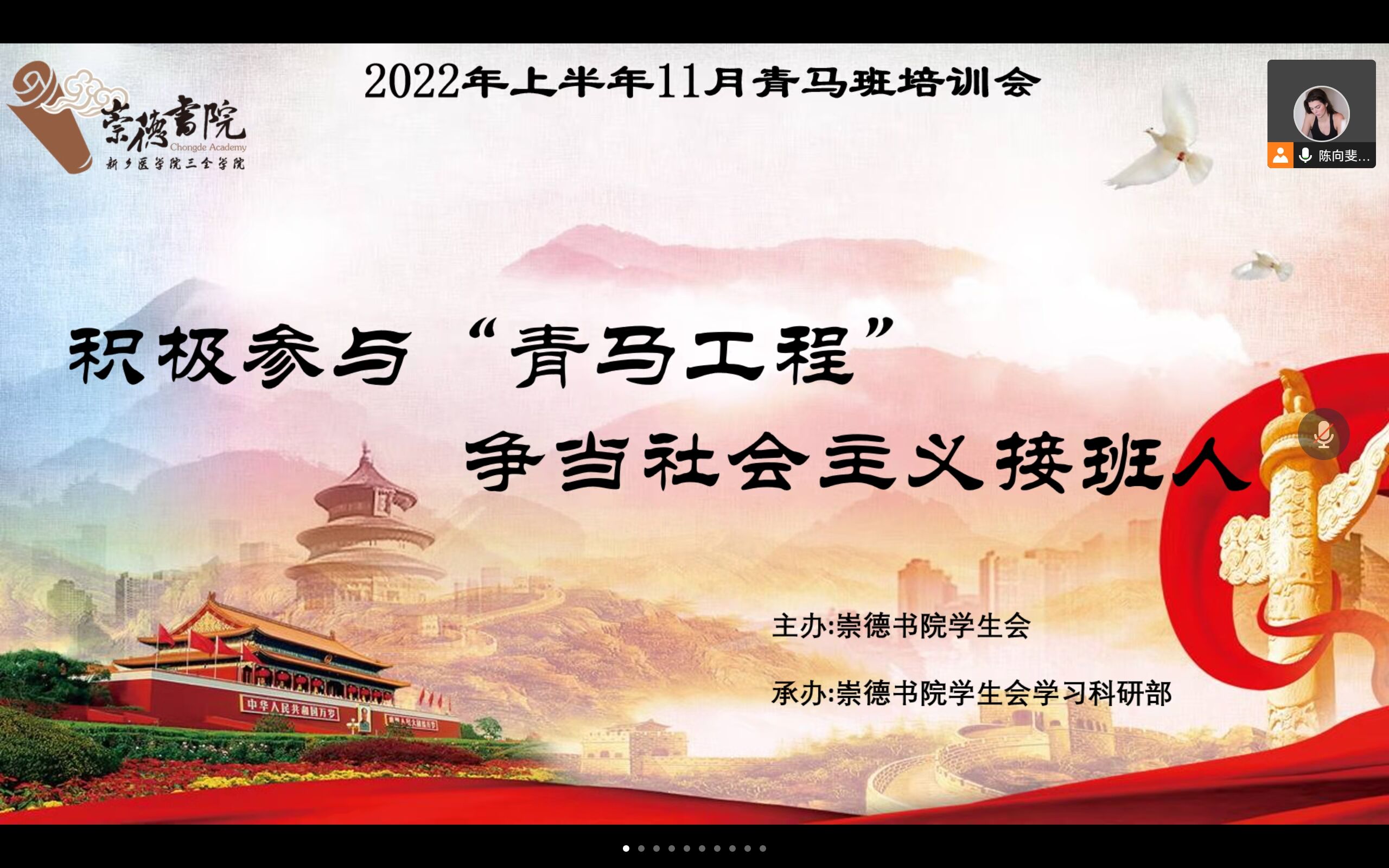 为促进崇德书院学生干部了解自身职责,提高学生干部政治素质,自主化管理、规范化建设的能力,提升其思想站位,同时加强学生干部之间的交流合作。在中国共产党第二十次全国代表大会胜利召开的背景下,崇德书院学生会分会学习科研部于11月21号线上开展崇德书院青年马克思主义者培养工程2022年上半年第一次培训,本次培训由新乡医学院三全学院崇德书院团总支书记张晟烨组织召开。