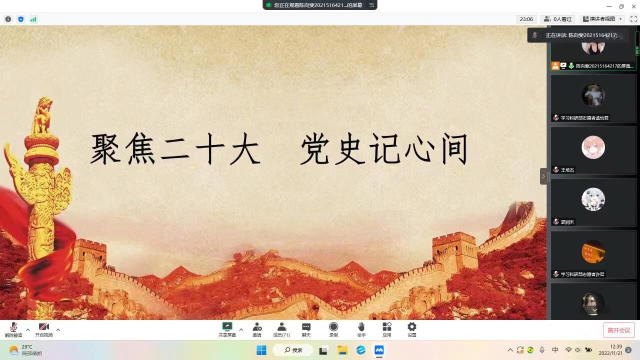本次培训会以“聚焦二十大,党史记心间”为主题,由学习科研部陈向斐带领大家共同学习。会议开始陈向斐向各位崇德书院学生干部陈述开场语,并从六个部分详细介绍了青年马克思主义者培训班。其中详细介绍了坚持党的领导的基本原则和培养一大批马克思主义中国化的青年马克思主义者的目标。会议中始终以二十大为主题为崇德书院学生干部讲解培训流程。期间播放了习总书记在党的二十大报告中对广大青年的寄语。在会议最后提出了青年马克思主义传播者应具备的四方面素质,其中主要强调了青年马克思主义传播者要具备深厚的群众根基,坚守人民立场扎根于人民群众,还要具有过硬的政治素质,树立“四个意识”,增强“四个自信”。