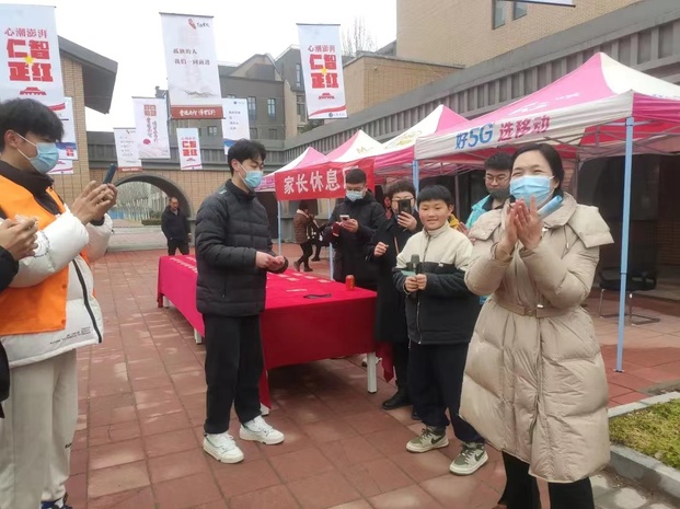 11点30分,现场氛围达到高潮,崇德书院党总支副书记杨翠苹组织学生和家长抽取20名幸运学子,请大家吃面条。“面条作为我国传统饮食文化的代表之一,不但象征着吉祥如意,更象征着福气安康,长长久久。给回家的人递上一碗面条,就是给回家的人一种祝福。借此寓意,请同学们吃碗面条,欢迎孩子们回家。”杨翠苹说道。