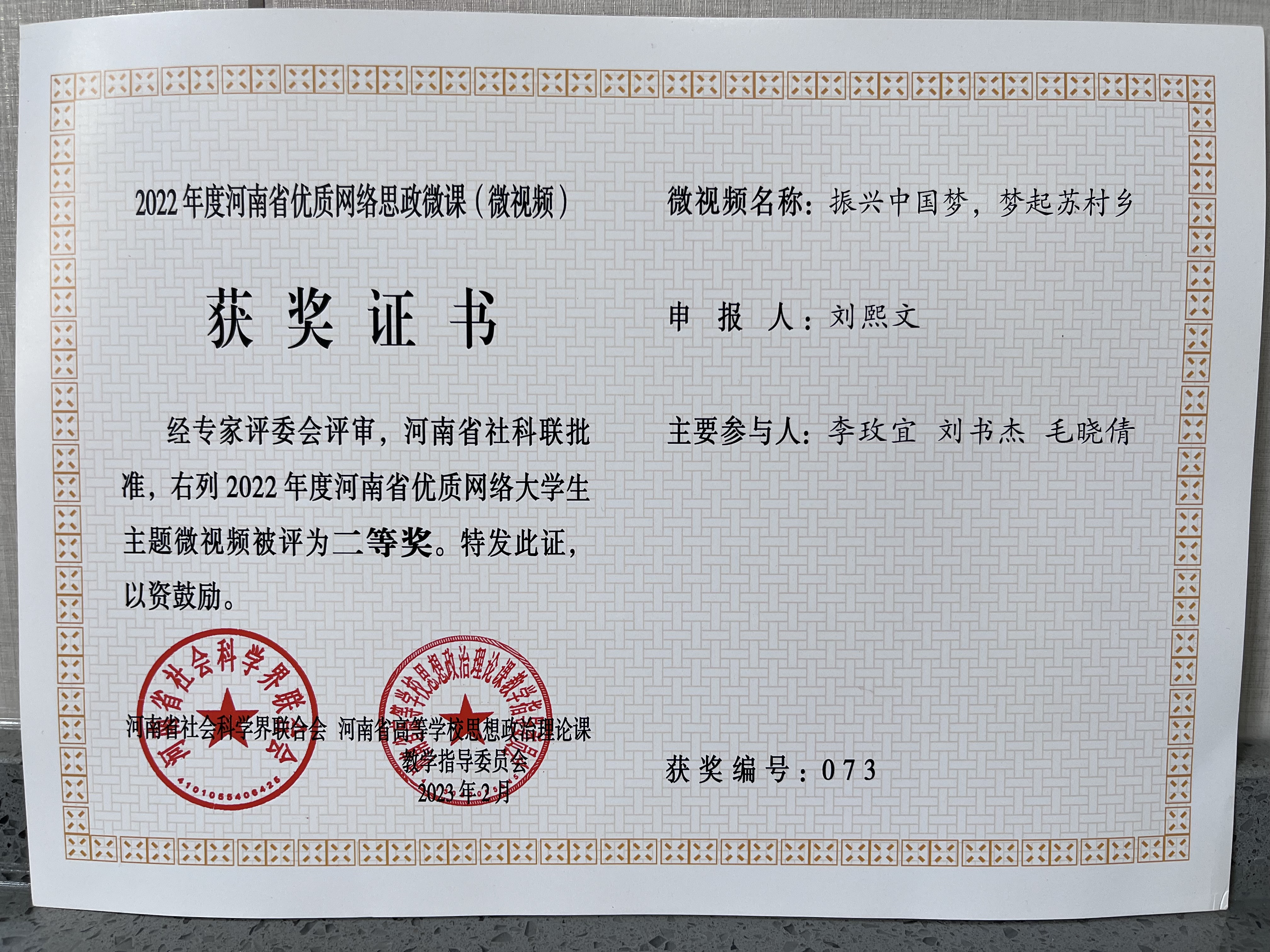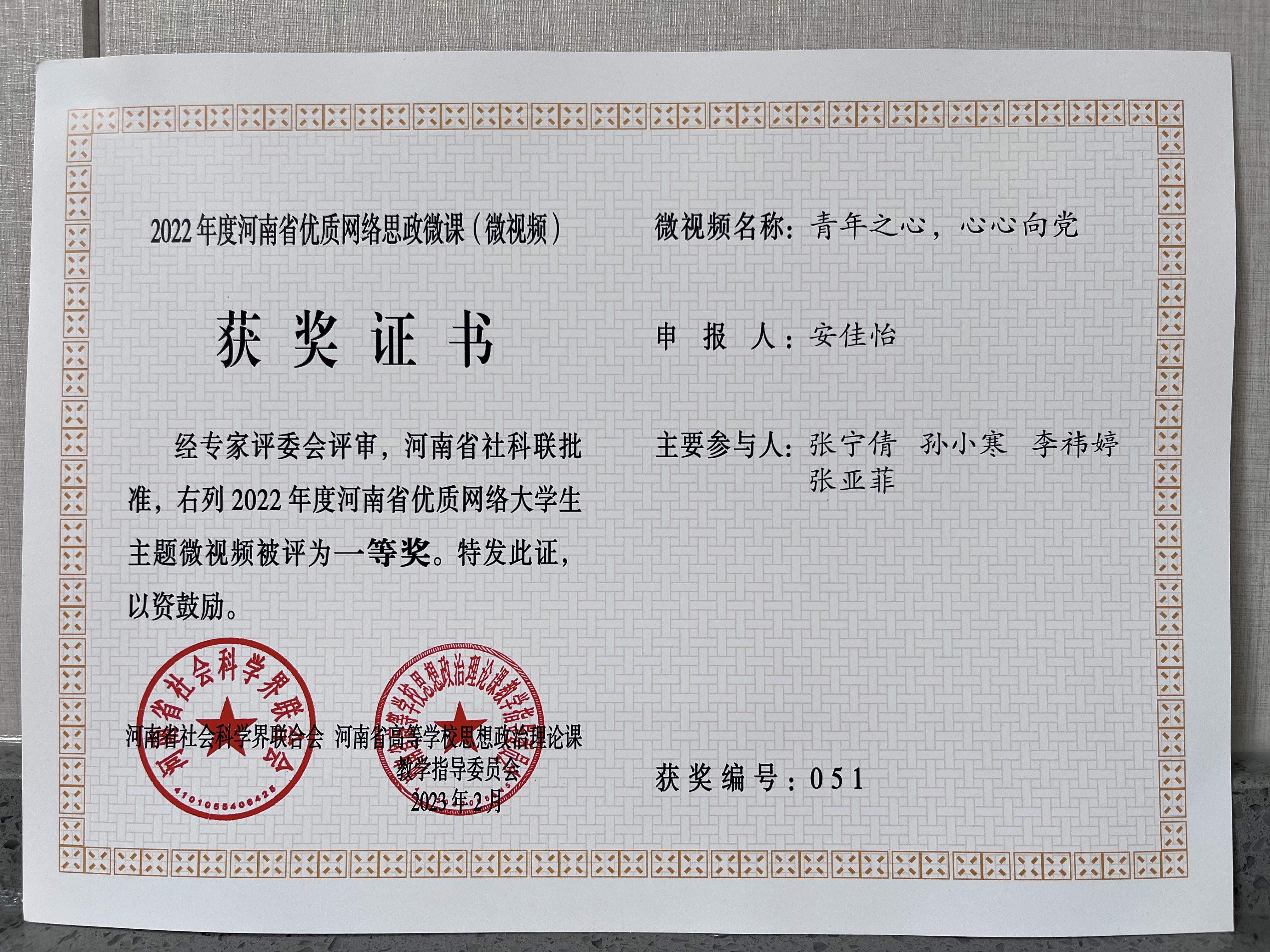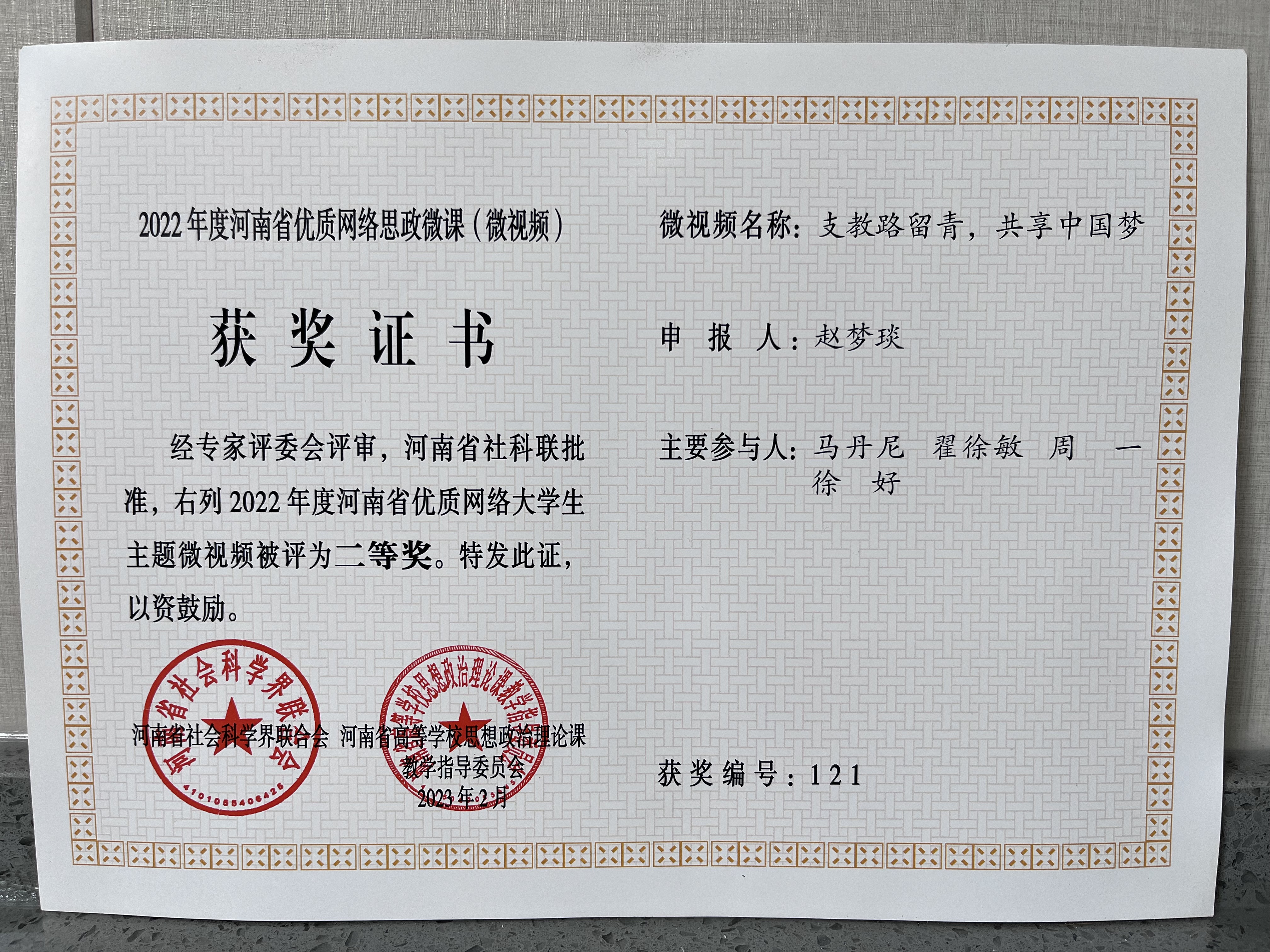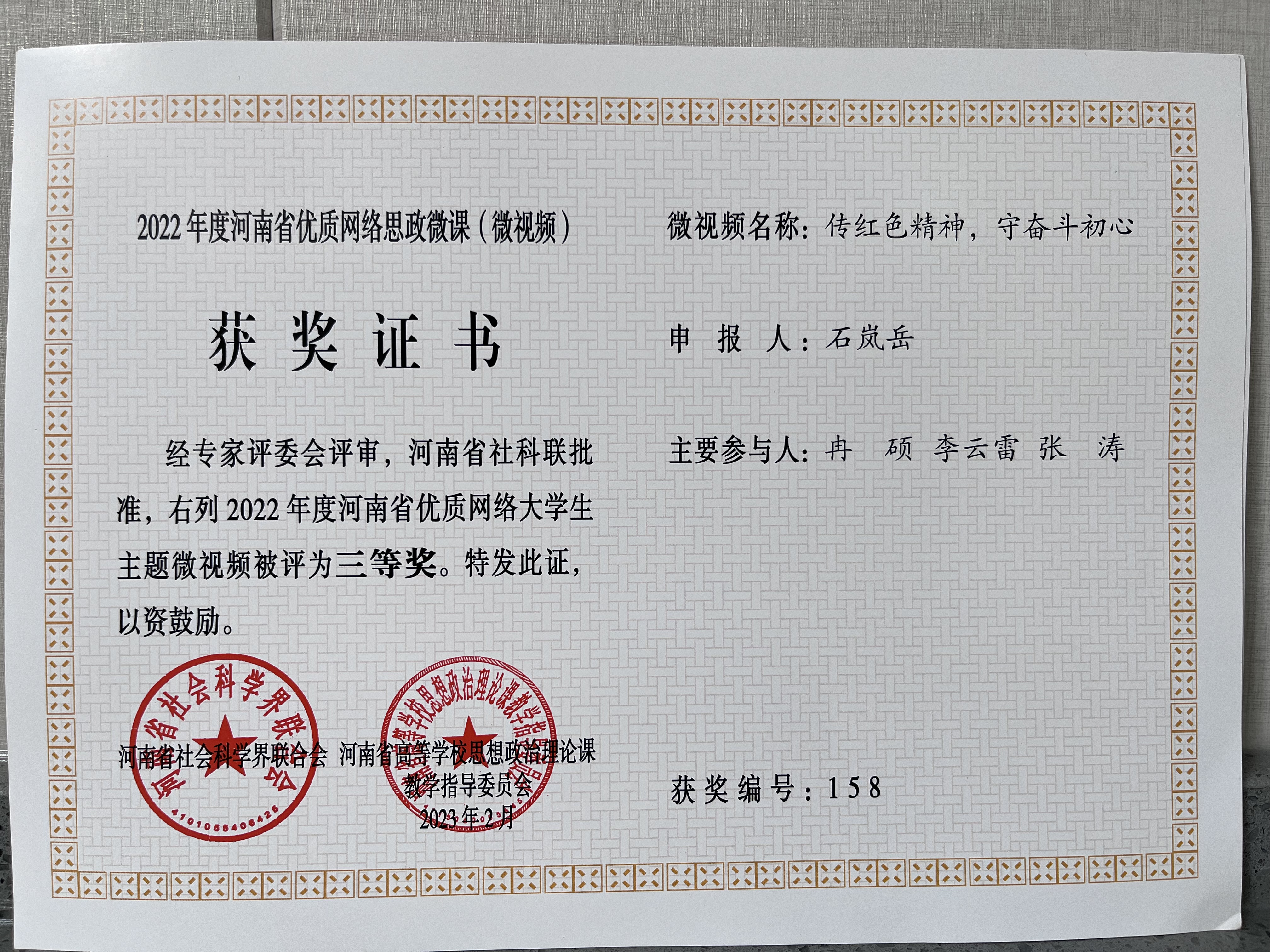 近日,河南省社会科学界联合会公布了2022年度河南省优质网络思政微课(微视频)获奖名单。在此活动中,崇德学子荣获佳绩,其中一等奖1项;二等奖3项,三等奖1项。