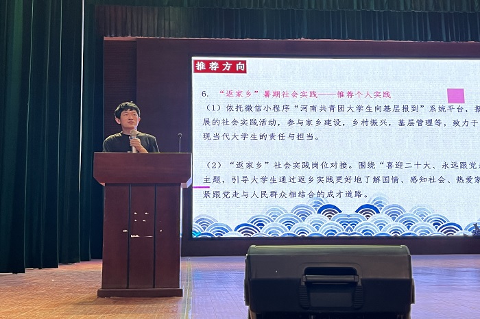 活动伊始,张晟烨详细讲解了2023年暑期社会实践活动的主题和总体思路,使同学们深刻认识到暑期社会实践的重要意义。并重点强调,22级本科新生作为暑期社会实践的重要人群,在此次活动中发挥着举足轻重的作用。随后张晟烨结合以往经验和学生实际情况,重点指出几个易于实践、能出结果的活动方案。如红色文化传播、科普知识宣讲、支教助学志愿服务等。并希望同学们充分利用此次机会,真正在实践中认识社会、了解社会、服务社会,不断提升自身的综合素质。