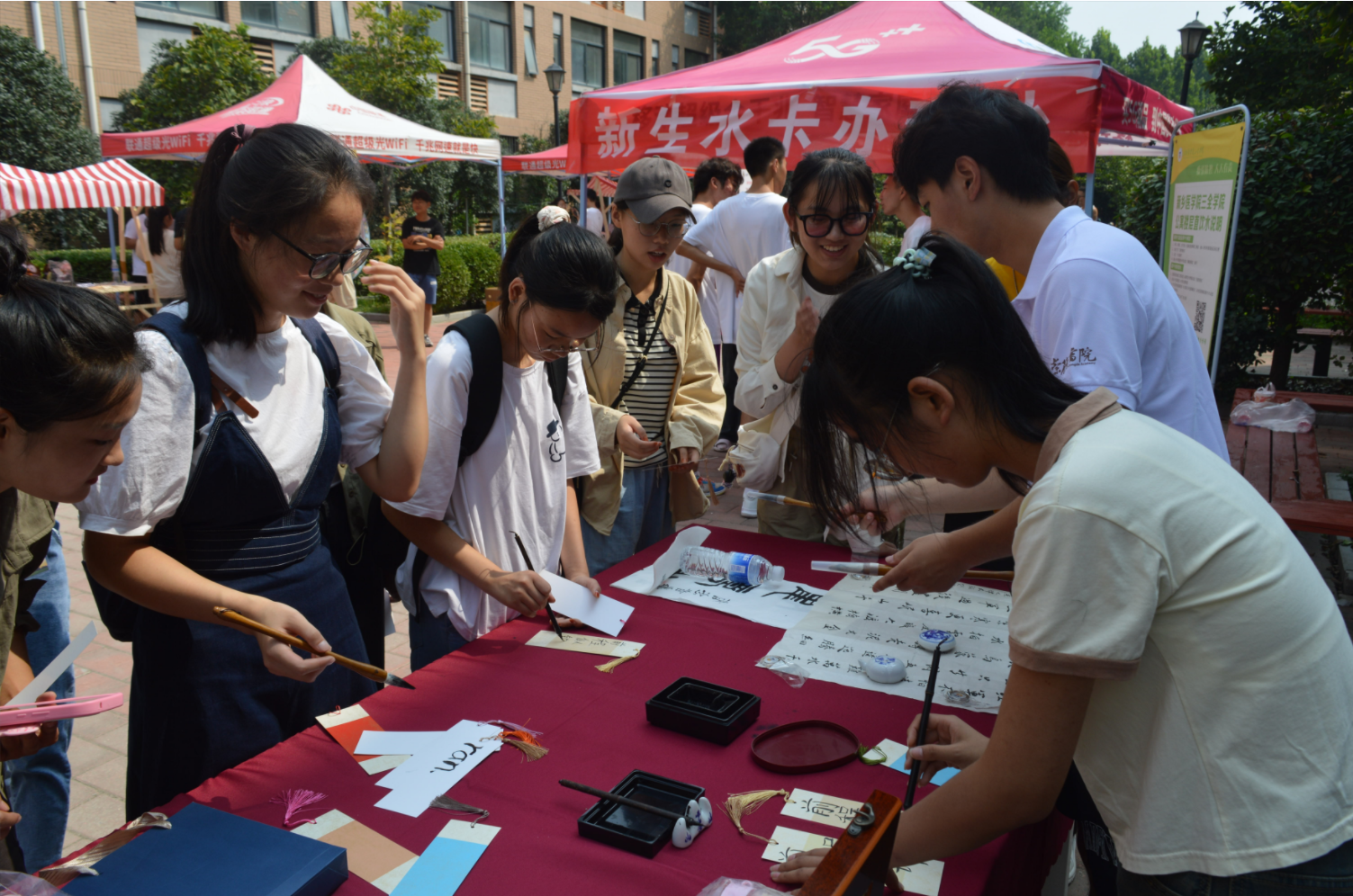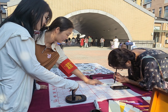 以文会友,共撷智慧。迎新现场,学校还准备了很多笔墨纸砚,志愿者们邀请有兴趣的家长和新生写字。“平安、快乐、幸福”“我上大学啦”“新学期 新气象 新征程”,一幅幅充满祝福的字画随笔而出。“虽然学过不少古诗词,但当自己挥笔抒写在纸上时,才真的体会到了古代诗人作诗时的酣畅淋漓。”医学检验技术175班李柯霏开心的说道。