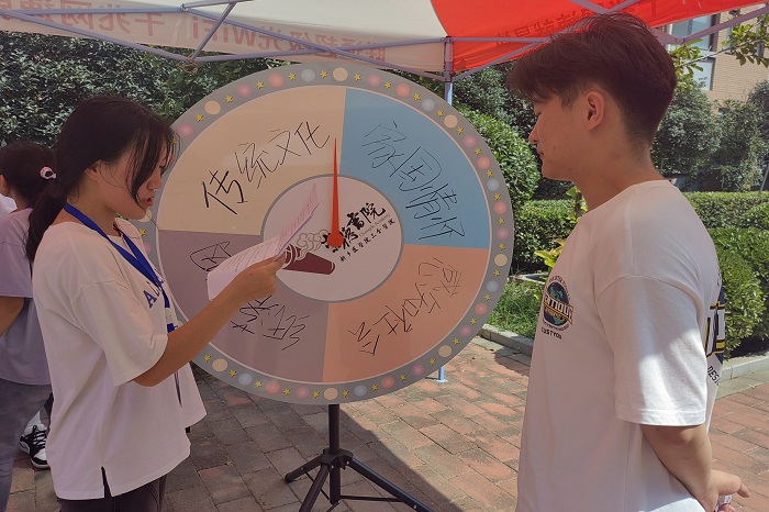 比知识,赛风采。新生通过转动转盘,随机抽取相应的问题,这些问题或关于传统文化,或关于国家历史。“请听题:”书法界的二王指的是哪两个人?”“王羲之和王献之”“六义指的是?”······23级护理学樊奇豪同学回答迅速,反应机敏,吸引不少过往师生,新生家长驻足观看,献出了阵阵掌声。