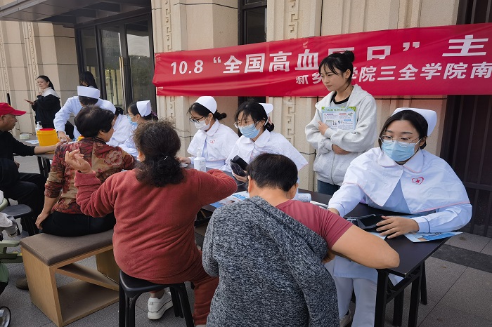 10月8日,在护理学院老师带领下,崇德书院志愿者前往新乡市凤翔社区开展高血压科普宣讲志愿活动。志愿者们通过现场咨询与交流、免费测血压、发放“全国高血压日”宣传资料等多种形式进行全面深入的宣传,并根据测量结果对老年人进行询问,认真了解老人的身体情况、生活习惯及用药情况,耐心解答老年人提出的问题,同时提醒老人们要根据自身情况,及时到医院接受更全面的体检和治疗。此次活动,不仅让社区居民享受到优质便捷的服务,同时也让志愿者们在今后的学习生活中践行“医者仁心”的初心使命,为广大人民群众的健康保驾护航。