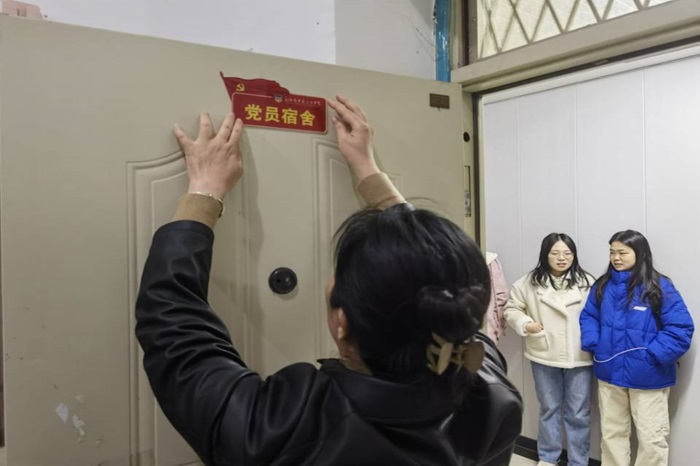 随后,学生第二党支部书记尚千红老师宣读了宿舍名单和管理名单,让学生党员们更好地了解自己的分组情况,以便更好的开展服务工作。学生第六党支部书记王静老师带领全体党员重温入党誓词,督促学生党员时刻牢记党的宗旨和党员义务,做好表率,积极进取,勇担时代大任。活动最后,杨翠苹亲自为9个宿舍张贴“党员宿舍”门牌,并与宿舍同学亲切交谈。