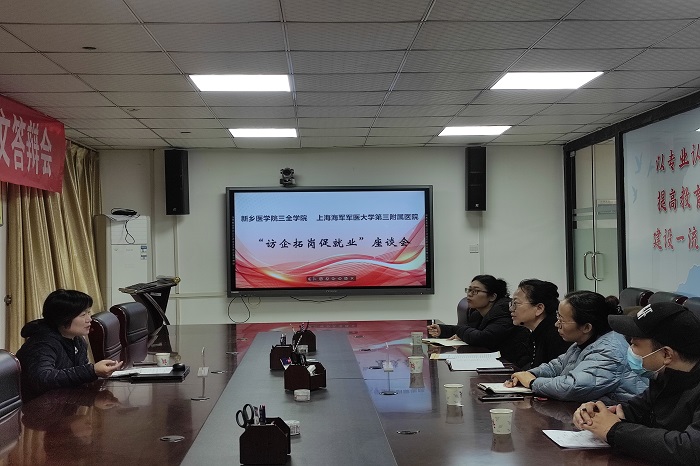 为进一步开拓毕业生就业渠道和就业资源,全力促进毕业生顺利就业、充分就业、高质量就业,12月9日上午,崇德书院、护理学院联合上海海军军医大学第三附属医院在新乡校区综合楼5楼会议室开展访企拓岗促就业座谈会。上海海军军医大学第三附属医院李丽主任、新乡医学院三全学院护理学院院长薛松梅、副院长王静、崇德书院就业专干王怀茂、辅导员王静出席本次会议。