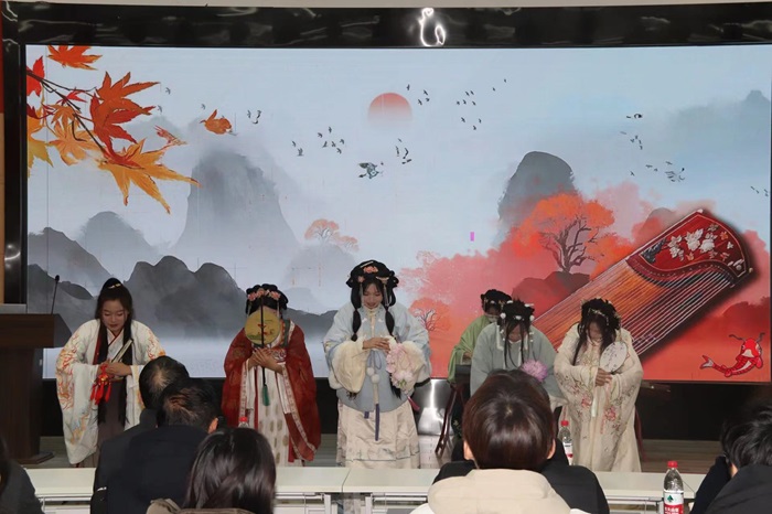 在统计分数间隙,崇德书院甘棠汉服社为大家带来了一段古筝表演--《兰亭序》。表演者身着汉服,将中华传统礼仪展示的淋漓尽致,她们的动作缓慢而优美,与古筝的旋律相得益彰,观众们沉浸其中,感受中华礼仪之邦的独特风采。